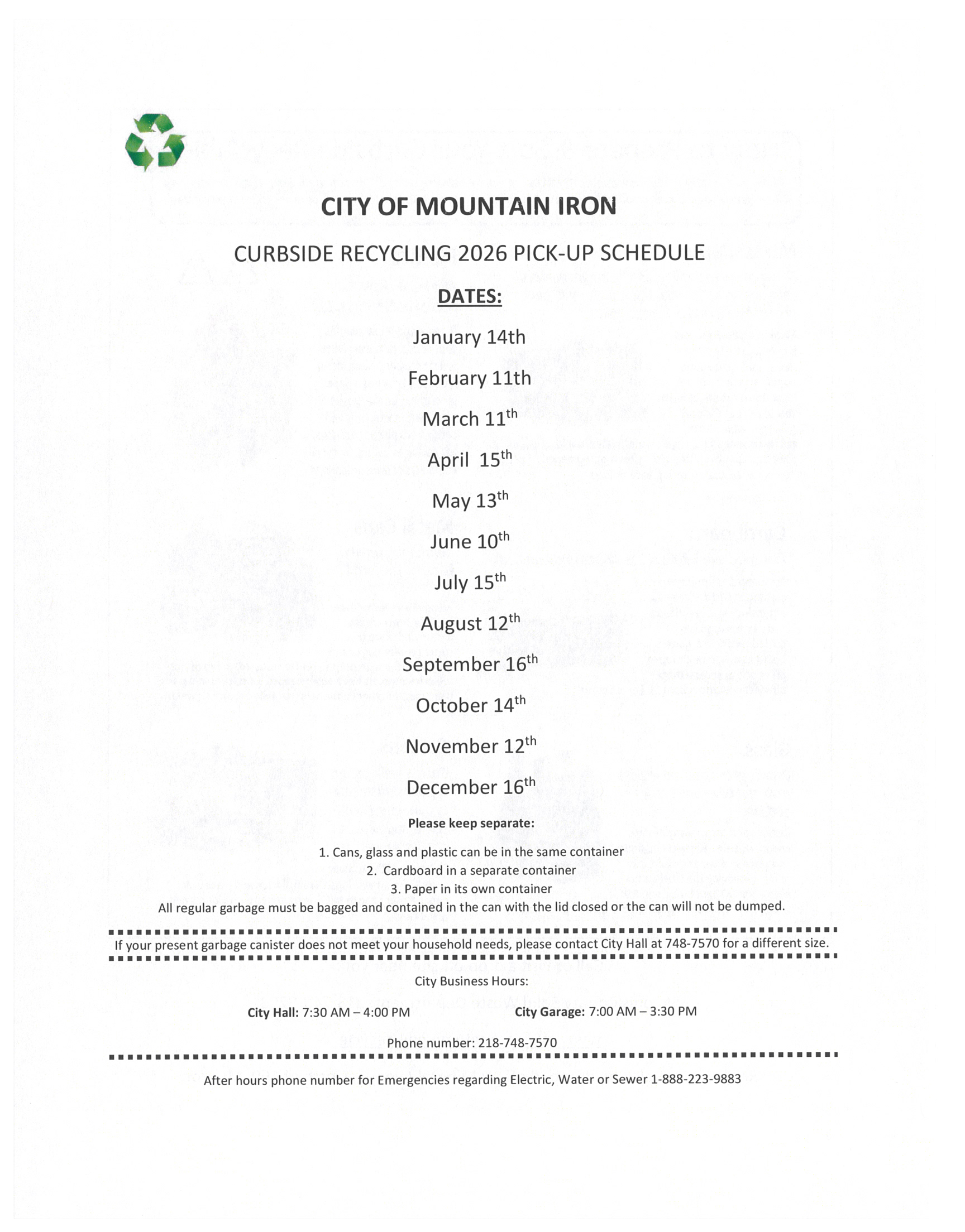 Recycling can also be dropped off at: Mineral Avenue, North of 169, Mt. Iron
